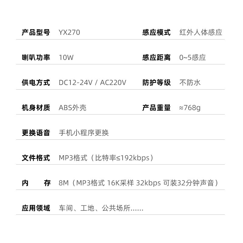 ±Ú¹ÒʽÓïÒôÌáÐÑÆ÷£¬10WÓïÒô²¥±¨Æ÷£¬Ó×·¨Ê½×Ô½ç˵¸ü»»ÓïÒô·½±ã¿ì½Ý£¬×°Öõ¥Ò»·½±ã£¬ºÏÓÃÓÚ¹¤µØ°²È«ÓïÒôÌáÐÑ£¬É̳¡µçÌÝ·öÌÝÓïÒô²¥±¨£¬ºì±íÈËÌå¸ÐÓ¦ÓïÒô²¥±¨Æ÷¸üÖÇÄÜ£¬Äܹ»DC12-24·ü¹©µç »¹Äܹ»AC220V¹©µç¶àÖÖ¹©µçÑ¡Ôñ£¬Äܹ»×ö¶à·´¥·¢½ÚÔì²¥±¨